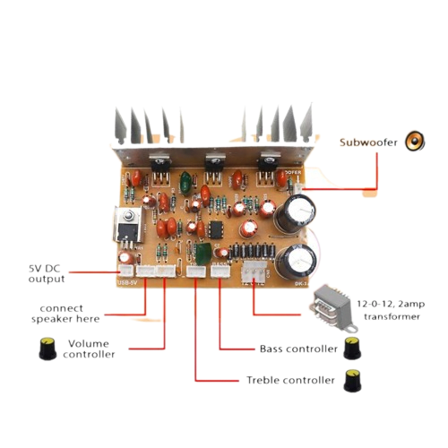 This is an average size audio amplifier board with bass boost capability. It is the branded and the best board in this price range. It is mostly used in 2.1 home theater sound systems. You can also use it in your DIY projects. It works on a 3 amp power system. This board comes with 3 inbuilt transistors (D2030A). It has an aluminum heatsink on its back for longer duration work.