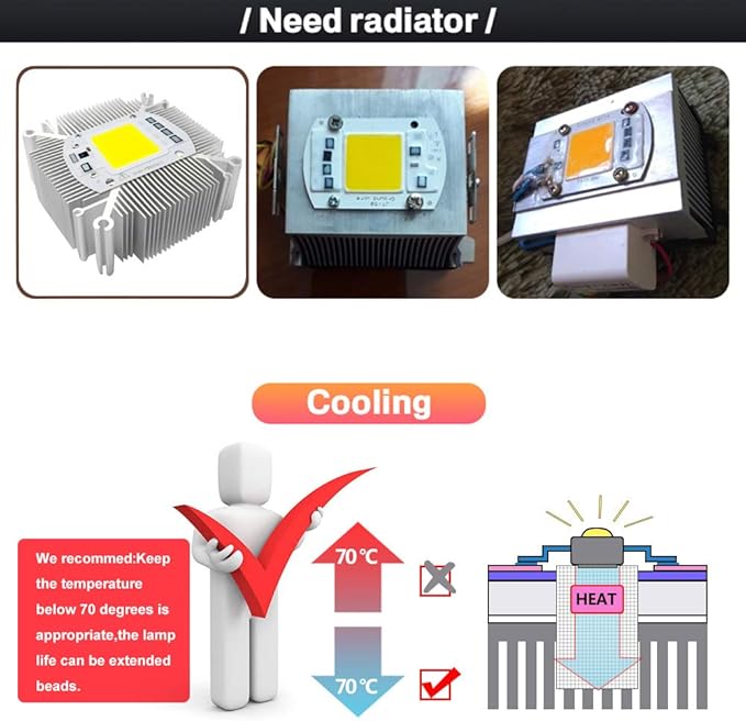 - There must be an aluminium heat sink for cooling. Keep the temperature below 70 degrees.