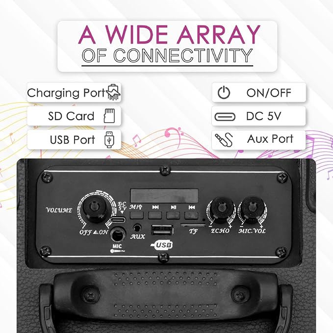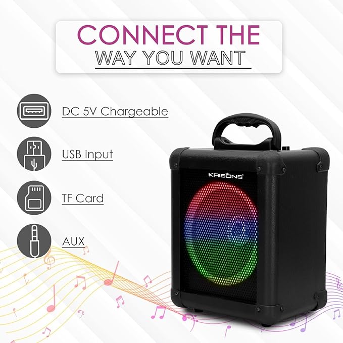 - Dynamic RGB Lights: Bluetooth Party Speaker is designed with 5 lightning effects.