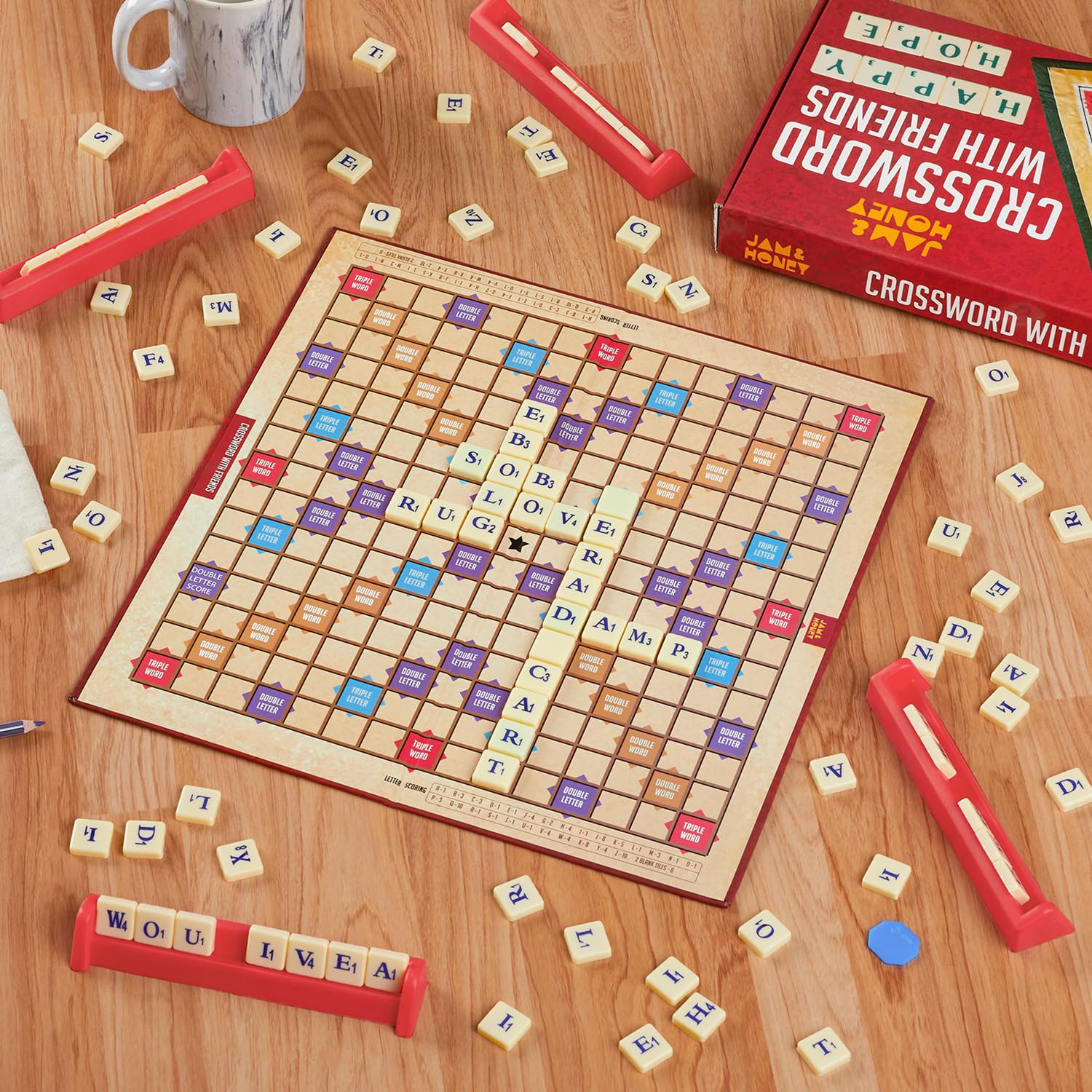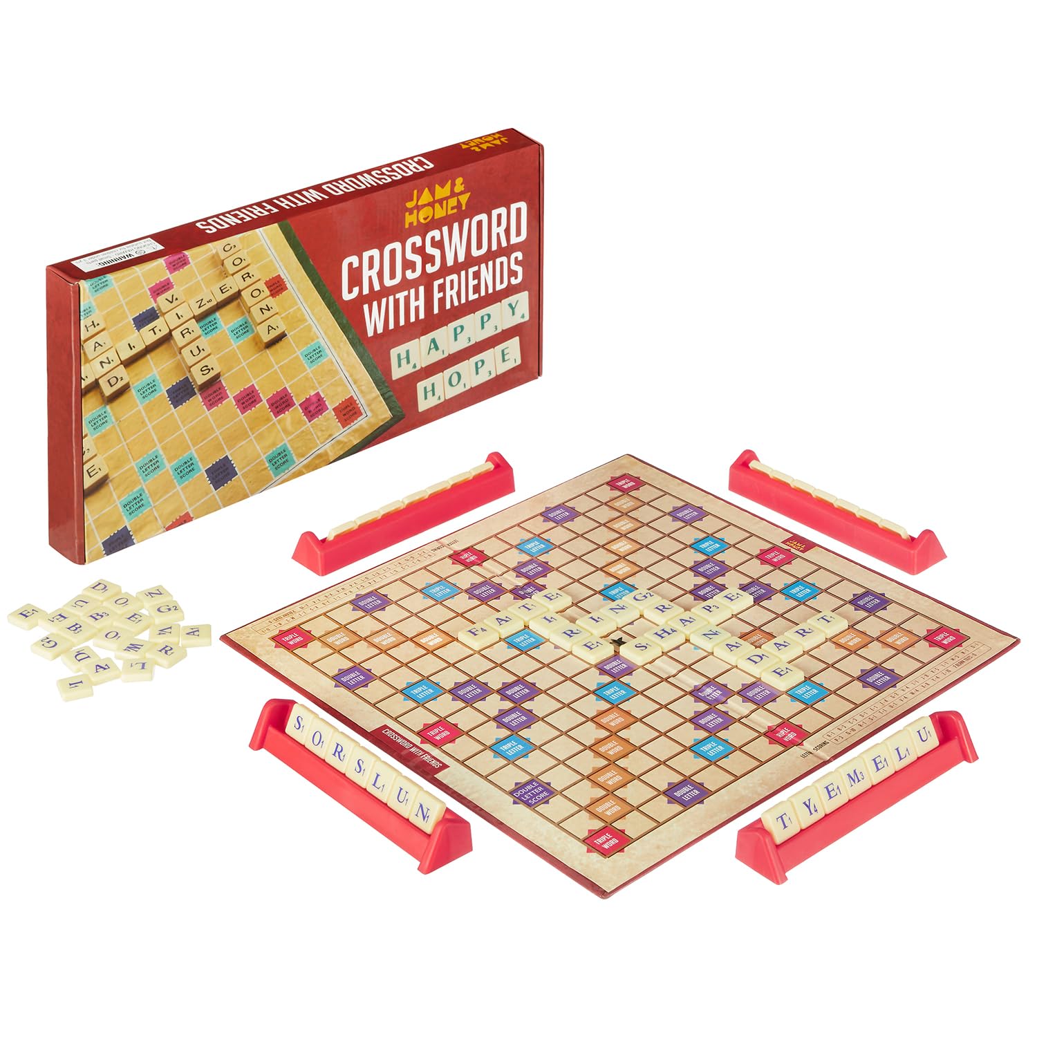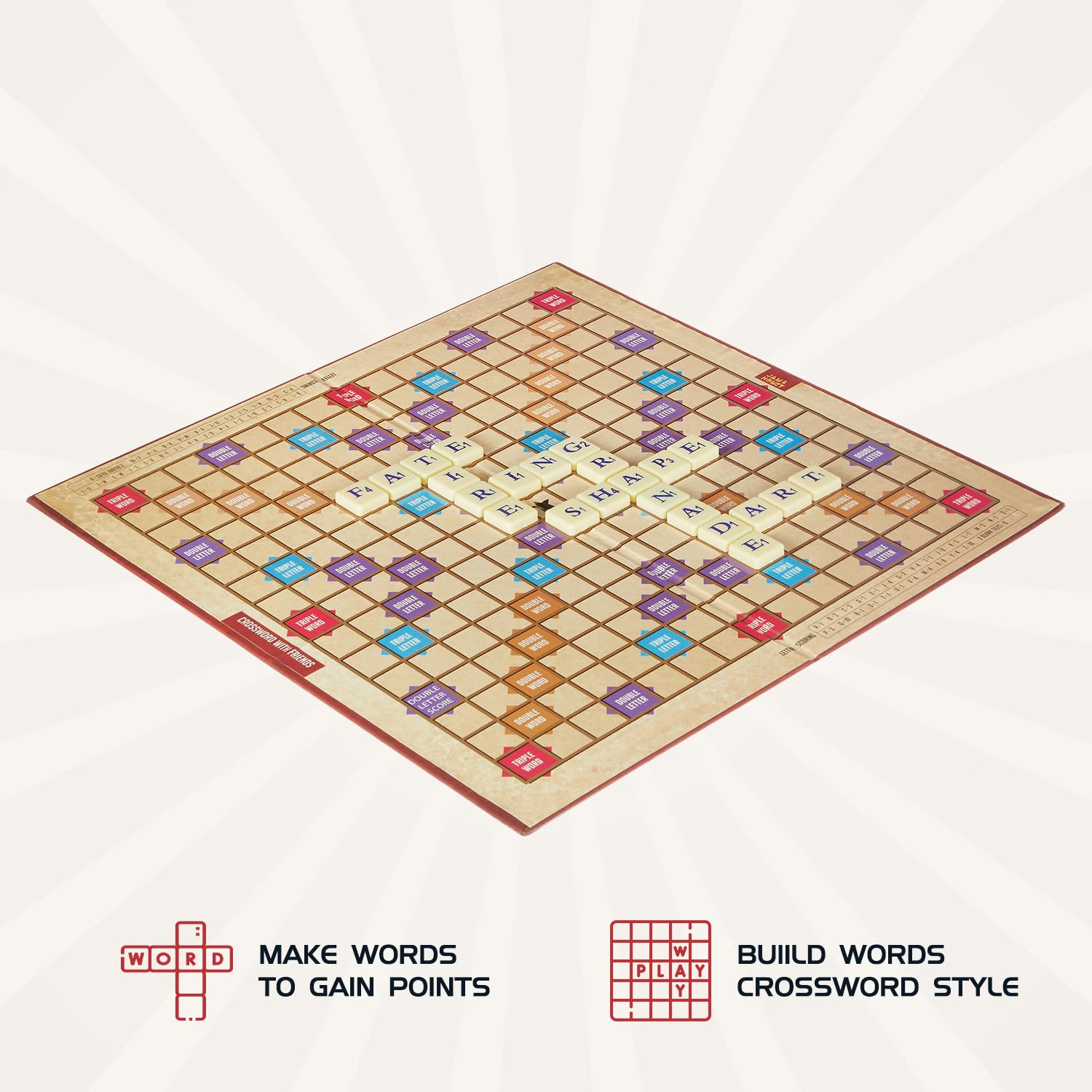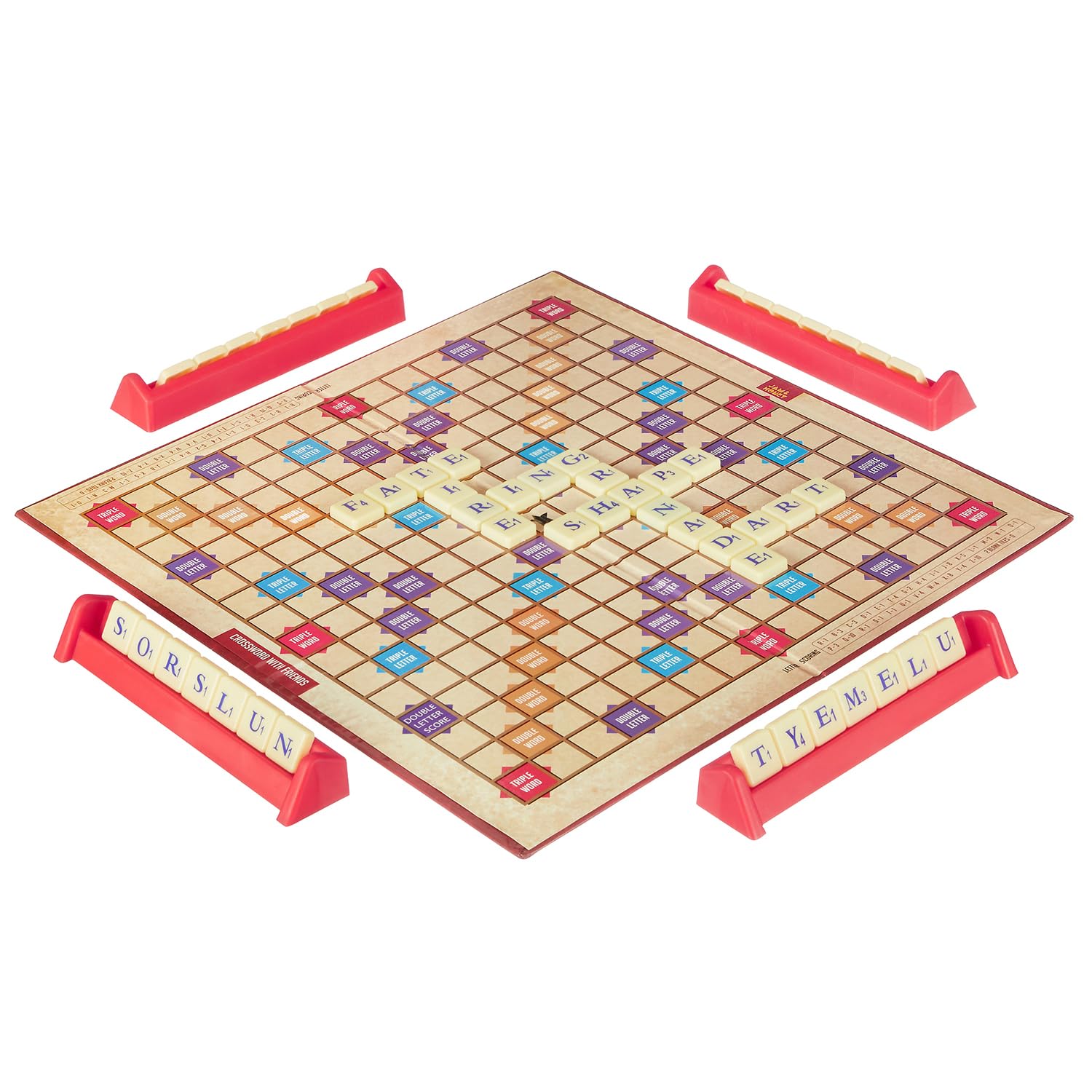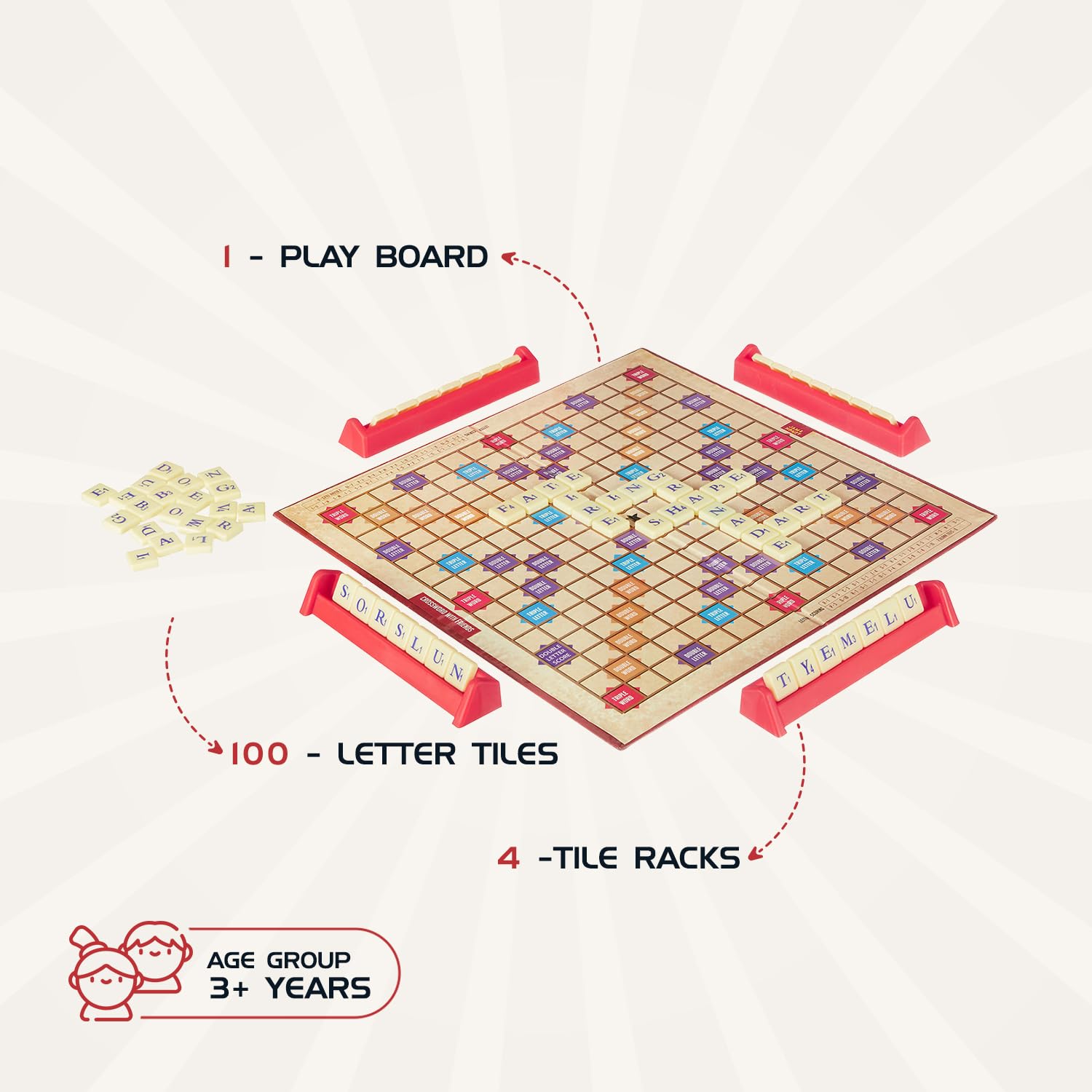 - Package Contents: 1 play board, 100 Plastic letter tiles, 4 tile racks and an instruction manual