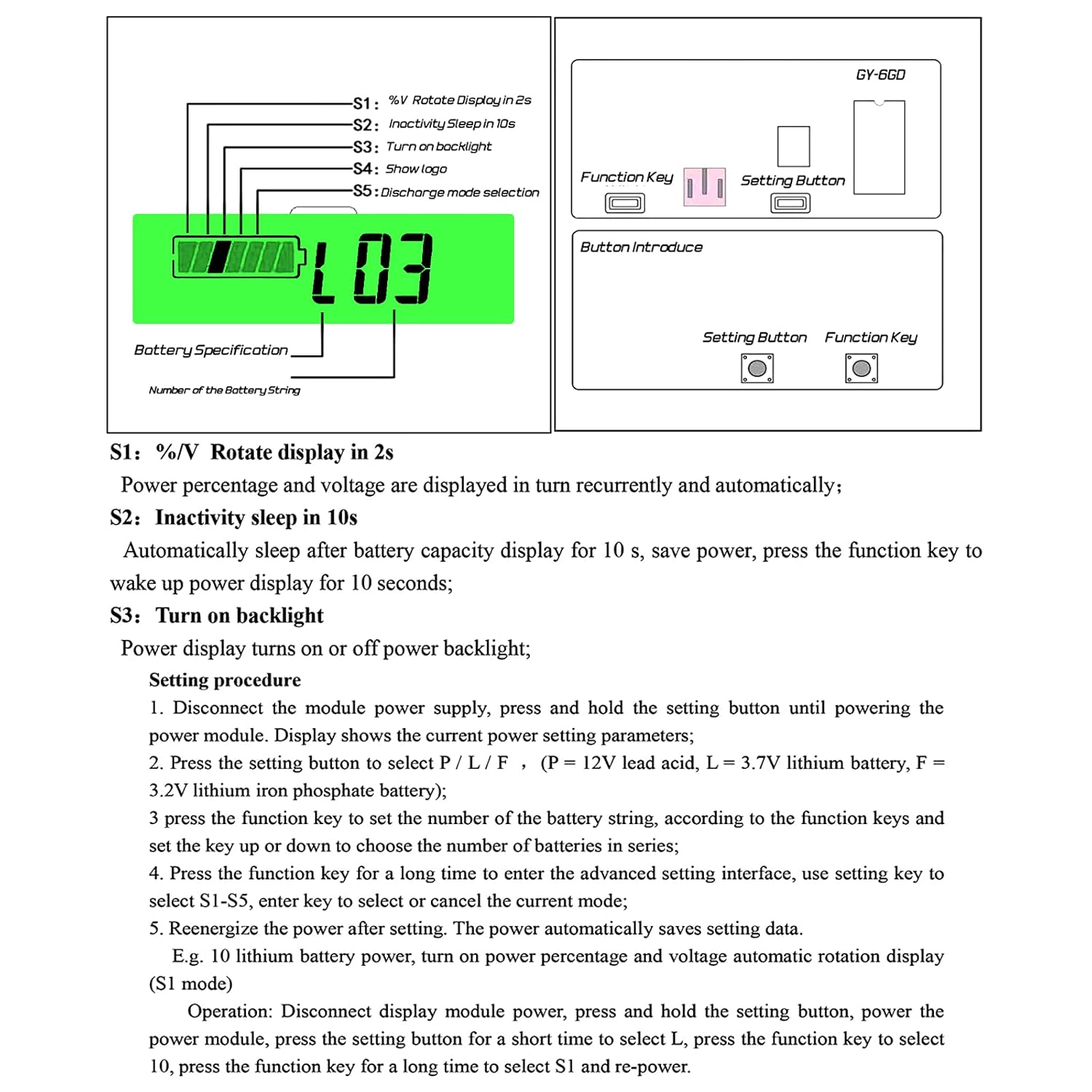 - Display Setting: – S1 setting will help you select if you want to see both charge percentage and voltage or any one. S2 setting will turn off the back-lit after every 10 sec of usage. S3 is back-lit setting is to keep back-lit on or off.