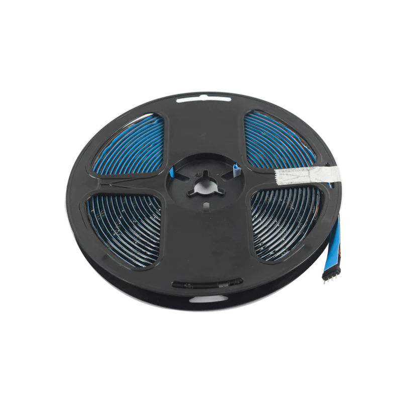 RGB LED strips feature a three-in-one LED chip with red, green, and blue LEDs. Combining the three results in a wide range of colours, and when all three are at maximum brightness, it almost appears white. Self-adhesive material is present at the backside of the strip.