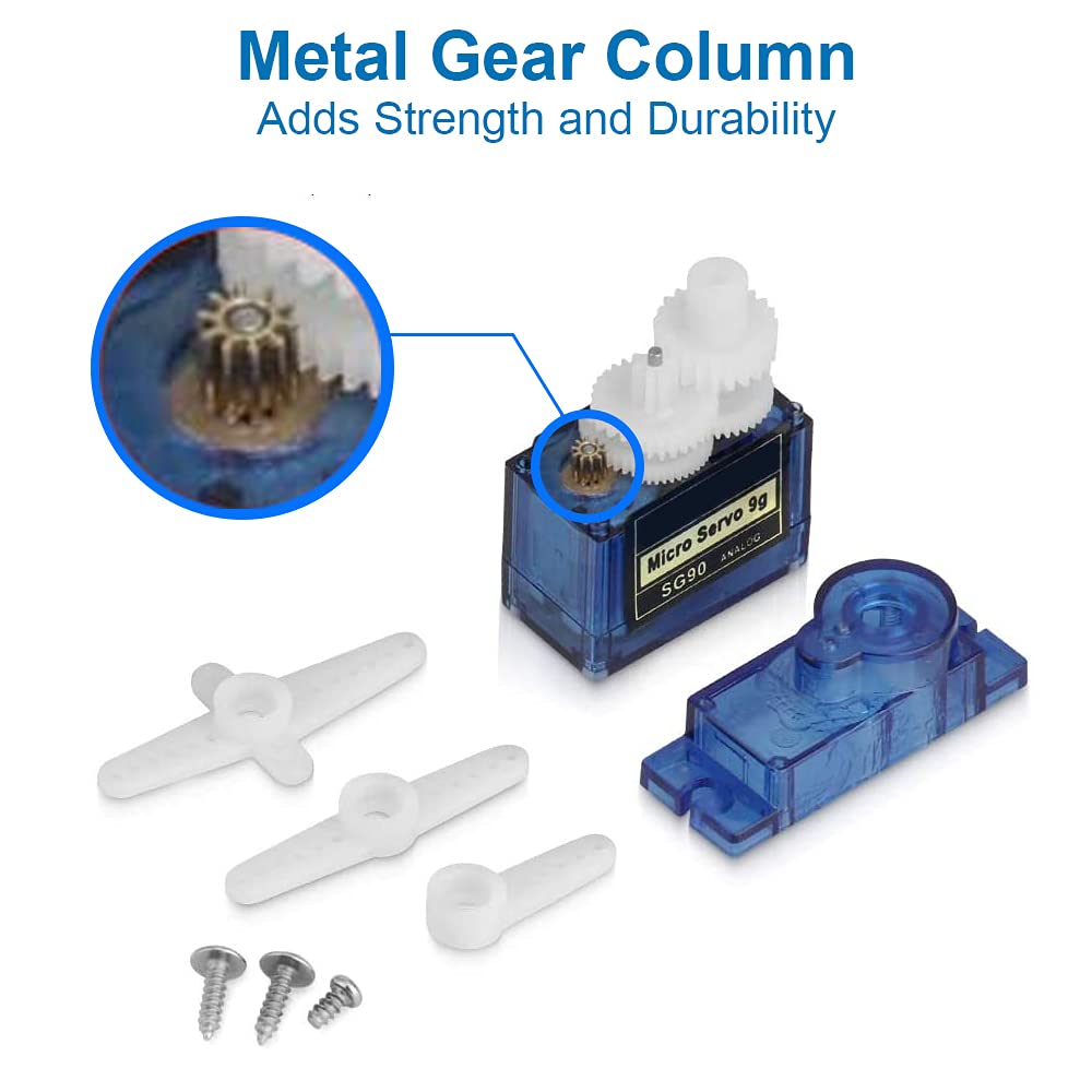 - Set Contains: 1x SG90 Micro Servo Motor 9G, 1x 3 Colored Cable (Brown / Yellow / Red) with a Futaba Connector Plug, 3x Servo Horn Steering Arms, 3x Stainless Steel Screws in different sizes: 9mm / 5mm