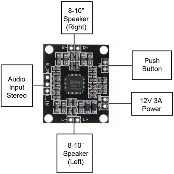 - The power amplifier has a high efficiency, large power, in the case of 12V power supply and can provide an output 10W + 10W power.